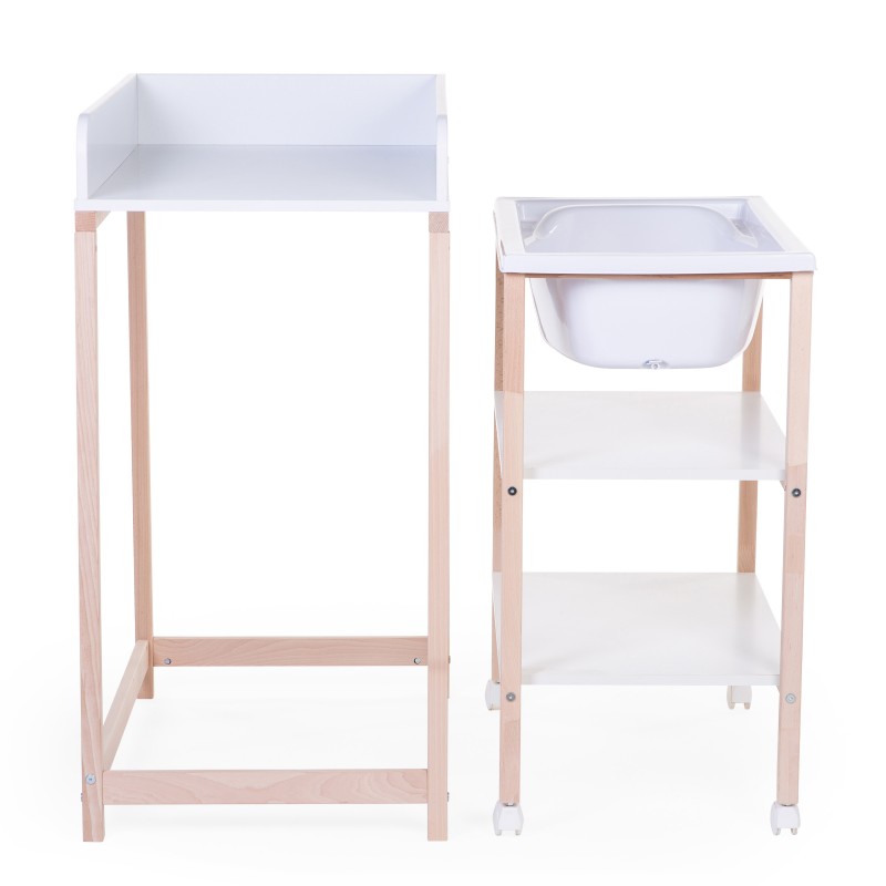 Deze handige verzorgingset bestaat uit een houten verzorgingstafel en een badje. De hoge zijkanten en de stevige constructie van de verzorgingsunit maken het veilig voor baby’s met een gewicht tot 11 kg. Dankzij de wielen onder het badje kan je het gemakkelijk verplaatsen en weer opbergen onder de verzorgingstafel.