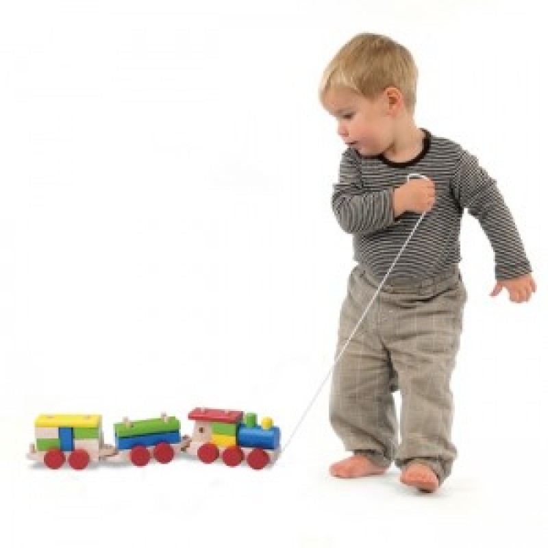 De stapel trein kan achter zich aan getrokken worden en de bijgeleverde blokken kunnen boven op elkaar gestapeld worden.
